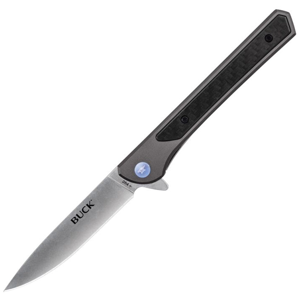 A sleek, frame lock folder that is the perfect choice for everyday carry. The 264 Cavalier features a gray anodized aluminum handle with a carbon fiber inlay and a blue fastener. This slim knife utilizes ball bearing technology and a blade flipper for a smooth, seamless opening. A stonewashed finish, stainless steel pocket clip adds carry convenience.