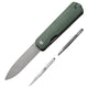 - Handle: Green/red G-10 handle with tweezer and toothpick slots.