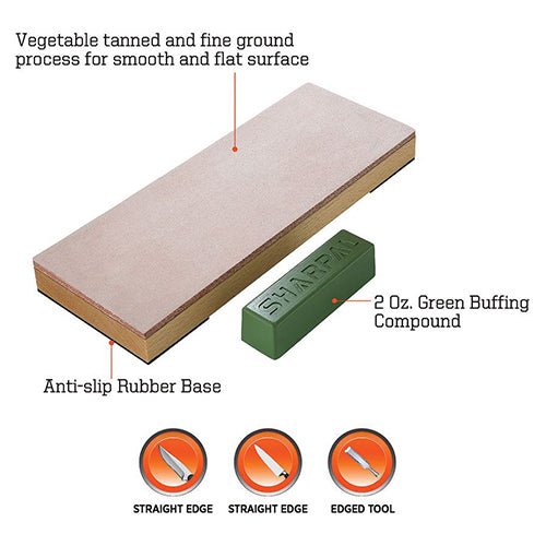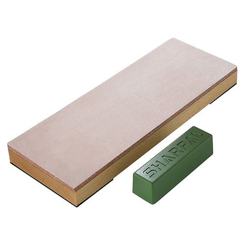 Sharpal 204N Leather Honing Strop with Compound is made for honing razor-sharp edges. It features genuine cow leather that is comfortable to use, as well as a green buffing compound to enhance your sharpening efficiency and the experience. The board is made of a solid beech block to guarantee reliable durability, while the 4-unit rubber base allows for great stability.